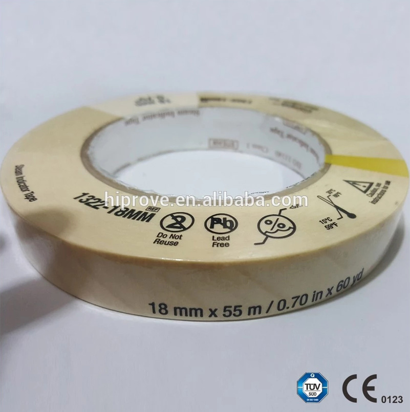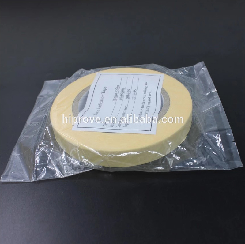 2. Usage: Intercept proper length tape, paste it to the surface of pending sterilized package and then sterilize. After sterilization, pick out the package and observe the change of tape. If the color changes from light yellow to grey/black,then the pack has been sterilized.