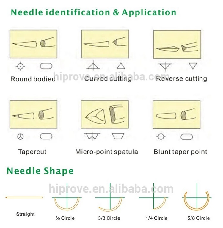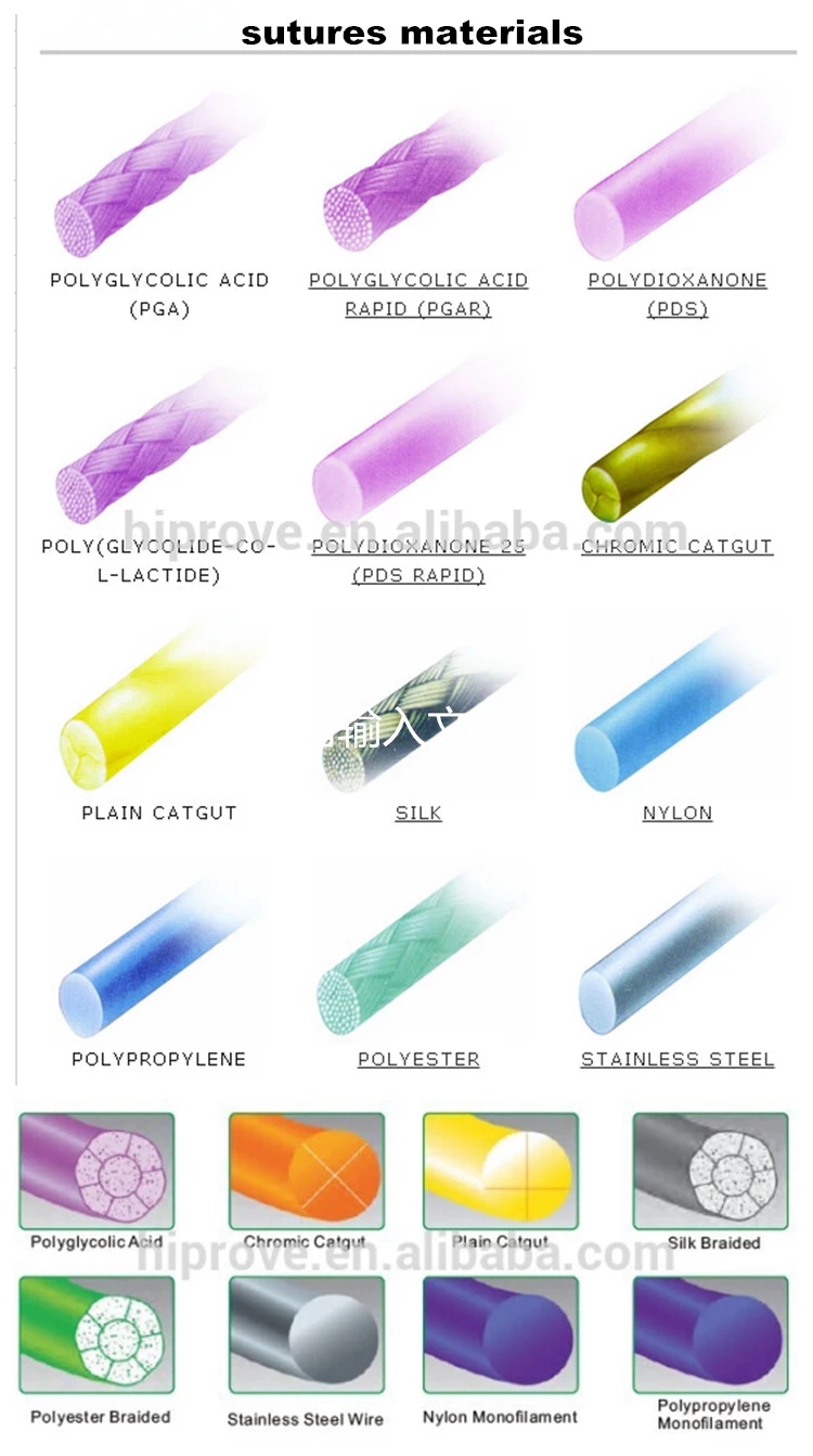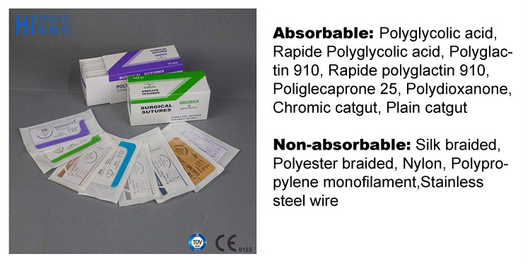 Material | Absorbable: Polyglycolic acid, Rapide Polyglycolic acid, Polyglactin 910, Rapide polyglactin 910, Poliglecaprone 25, Polydioxanone, Chromic catgut, Plain catgut Non-absorbable: Silk braided, Polyester braided, Nylon, Polypropylene monofilament,Stainless steel wire |