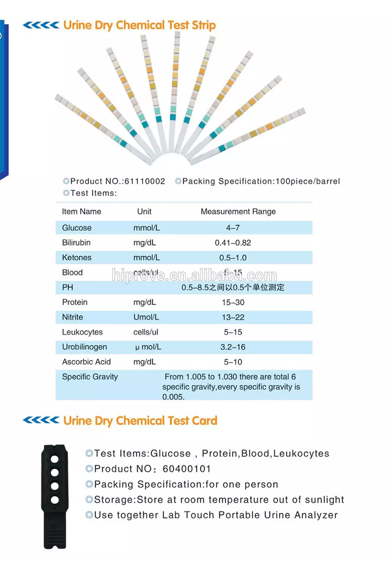 The Urinalysis Reagent Strips (Urine) are firm plastic strips onto which several separate reagent areas are affixed. The test is for the qualitative and semi-quantitative detection of one or more of the following analytes in urine: Blood, Nitrite and Leukocytes.