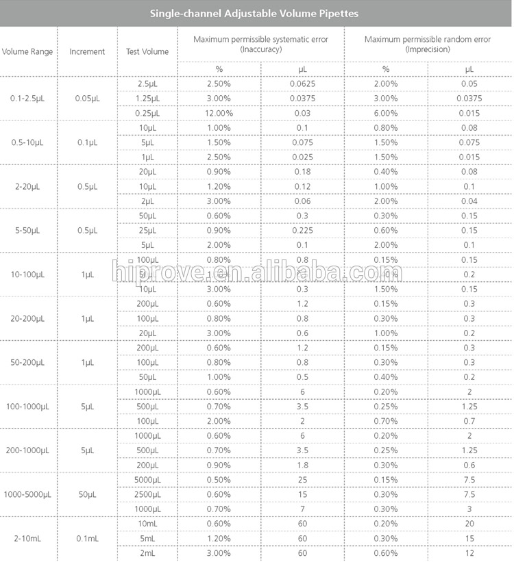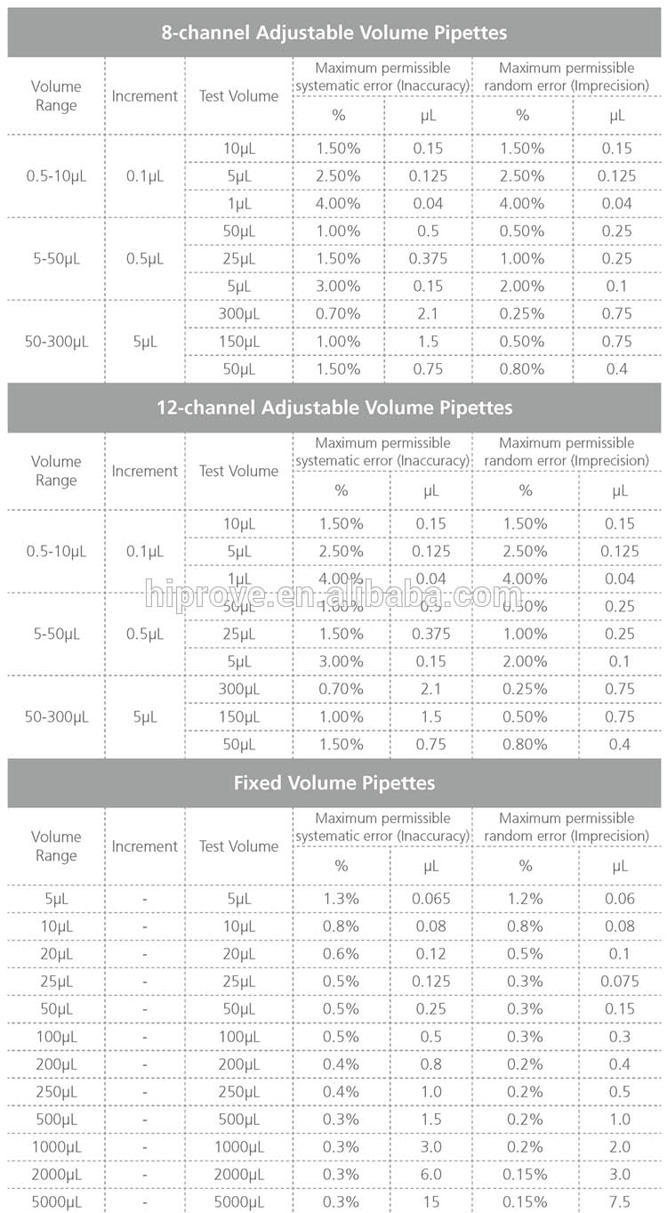 - The pipettes cover volume range of 0.1μl to 10ml